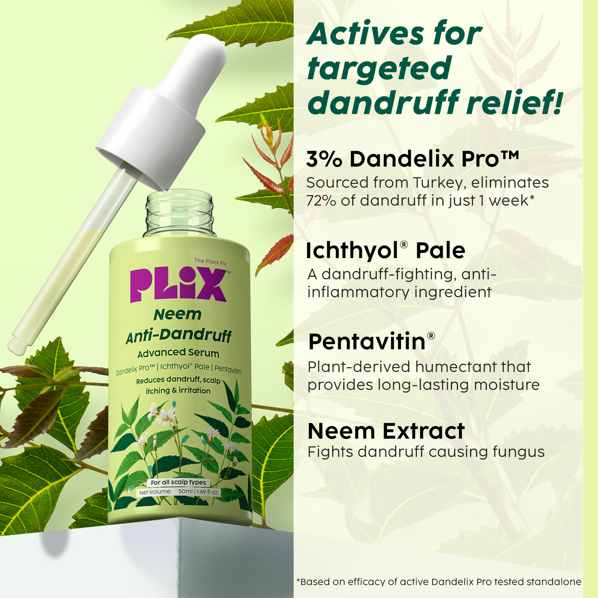The 3% Dandelix Pro™ in the Plix Neem Anti-Dandruff Advanced Serum is known for its scalp-cleansing and balancing properties. It helps maintain a cleaner, fresher scalp environment and supports the appearance of reduced flaking with regular use.